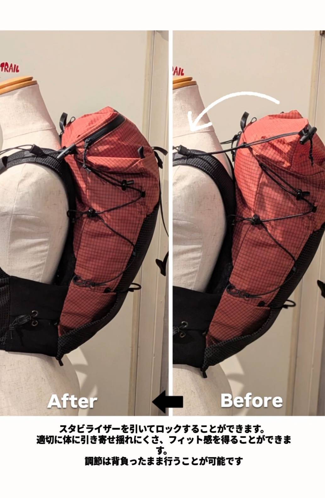 "X"ではスタビライザー位置を任意に変更できるしようとなっています。荷物量に応じて最適なフィッティングを提供します。