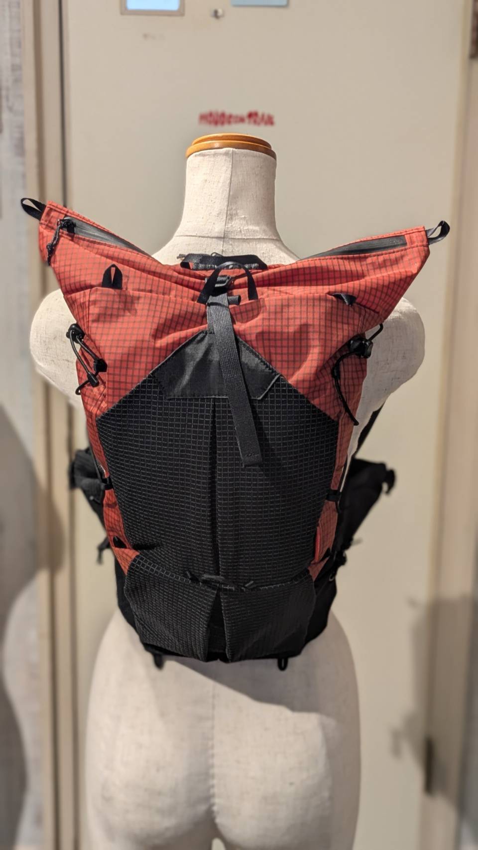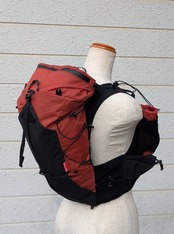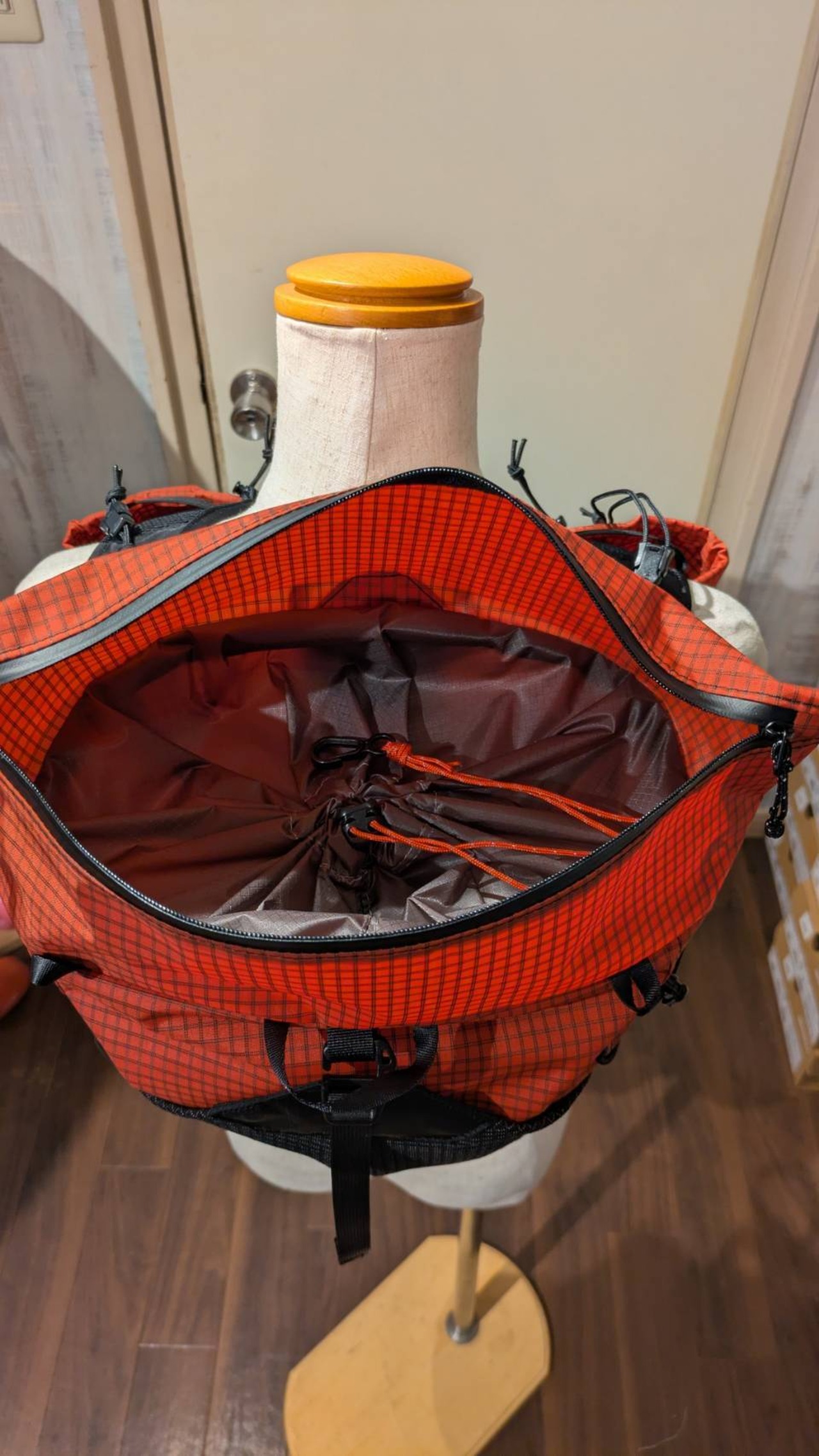 ⑤トップのストレージはメインコンパートメントのから上に伸びる構造となっています。2か所のストレージ間は巾着により絞られ仕切りとして機能します。巾着を開放し一気室とすることも可能です。