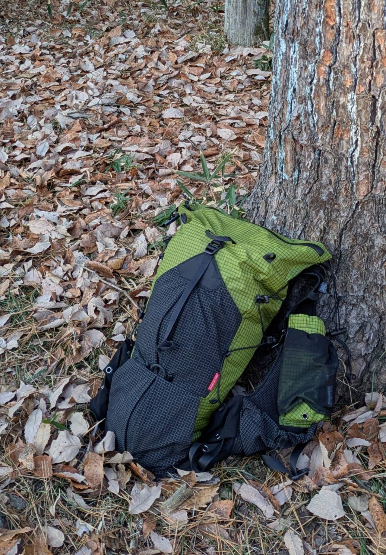 左右の脇ポケット内側に2本の平行ベルトを配置。ベルトを締めるとザックが背中に密着し、荷物の揺れを抑制