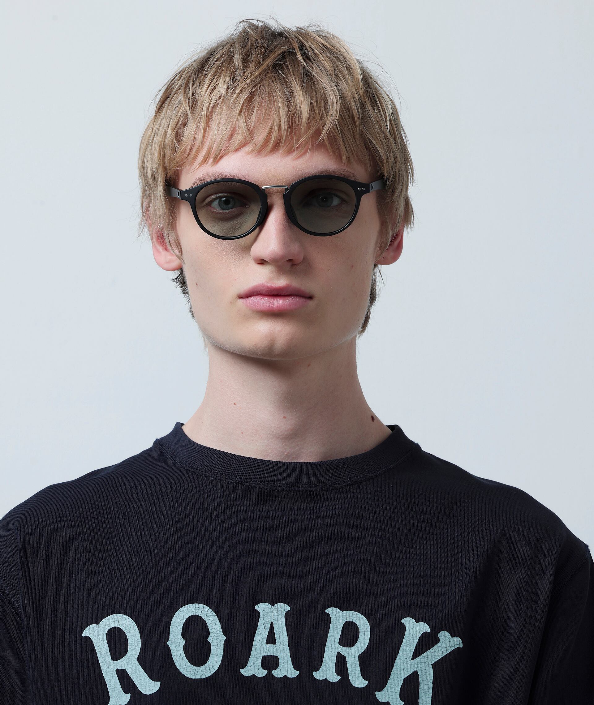 フレーム全体をスリムに仕上げることで見た目、着用感ともに軽快さを感じられるがメタルのカシメ(ドット鋲)でクラシックさも演出されている