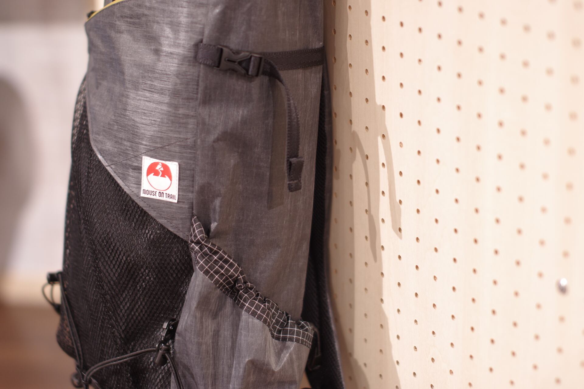 サイドポケットはメイン素材と同素材で作ってあります。メッシュやストレッチポケットでは引っ掛けたりすると穴が空いたりするため耐久性を重視しました。下部には水抜き用の穴が空いています。また口の部分に使用しているゴム紐は交換ができるように作ってありますので長く使用できると思います。