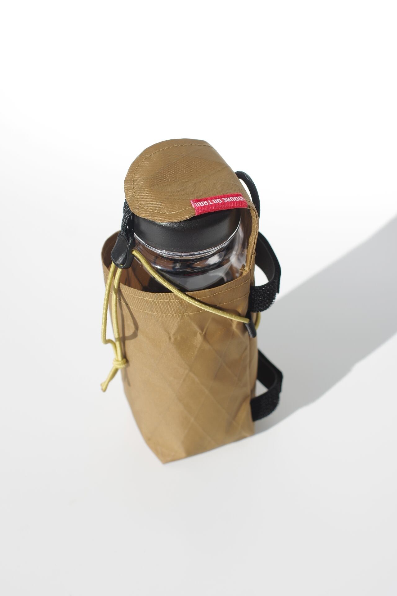 上から抑える構造なのでボトルが飛び出す心配もなく、また口を絞ったり、頭にゴムを掛けたりとする必要もない合理的なホルダーです。