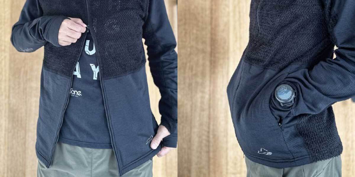milestone ”Cloud Hoody”はこの生地をメインにより冷やしたくないお腹、手首周りにグリッドフリースを部分的に使うことで最適なマッピングを施しています。