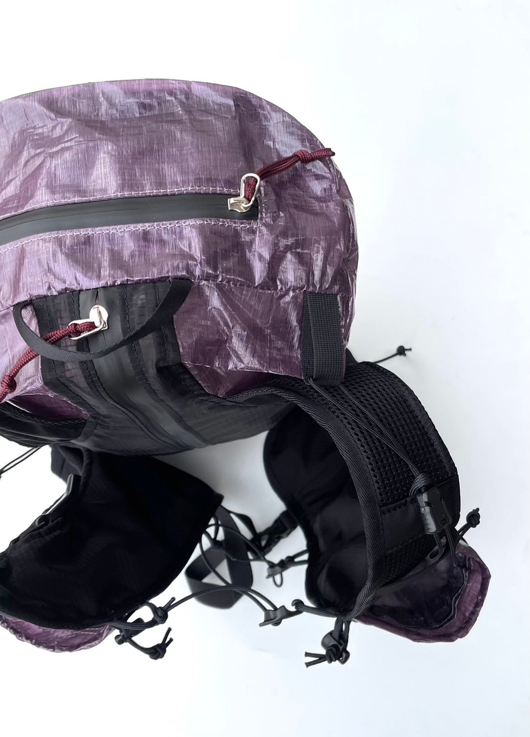 メインコーパトメントへは背面からアクセスします。フロント側には大きなパワーメッシュのポケットを配置。このポケットは収納力を上げるほかにパック下部が大きく膨らまないようにコンプレッションする機能も兼ね備えています。